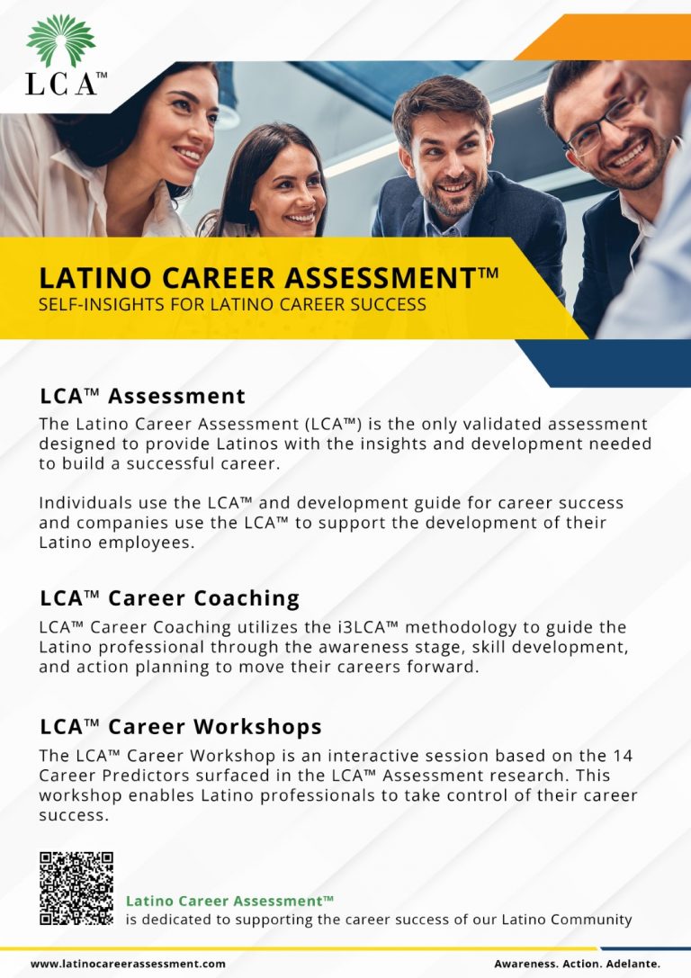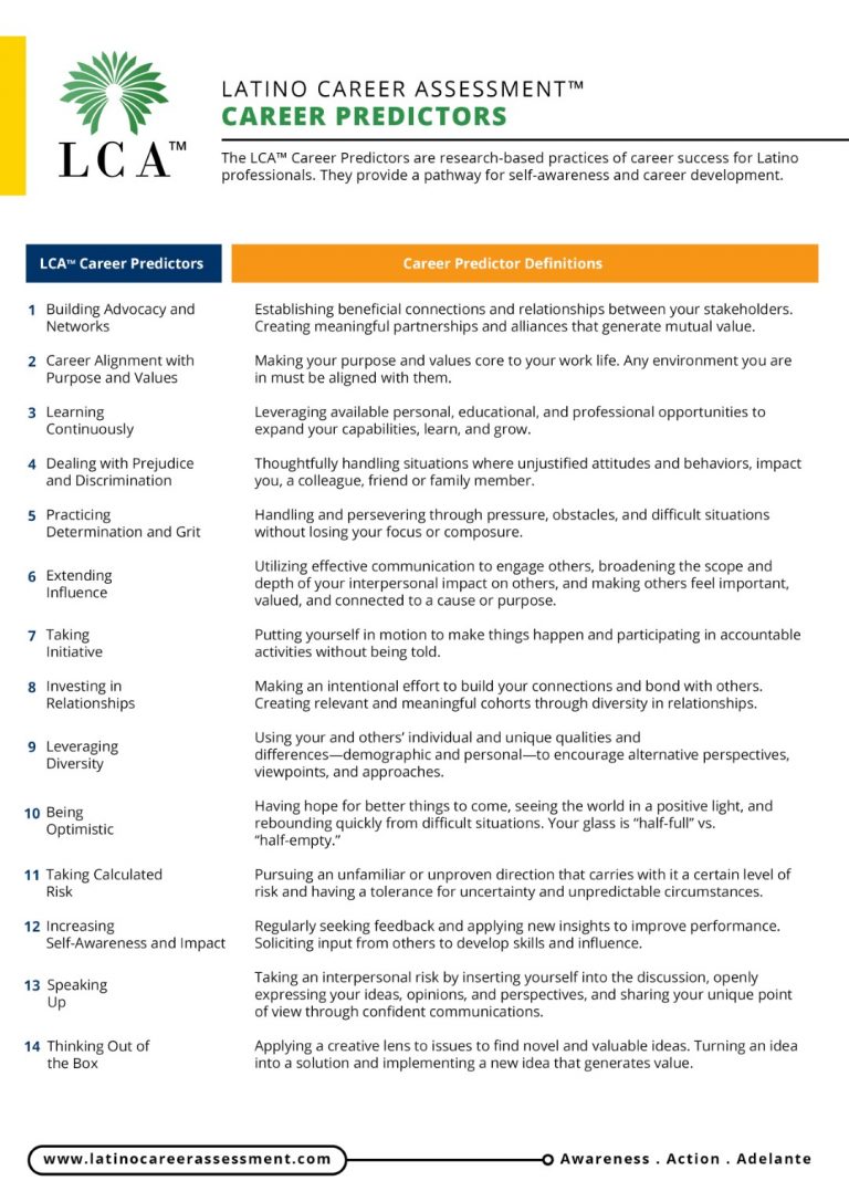 This research overview will outline the LCA’s construction process, including emerging theme identification, final LCA™ Career Predictors development, and item and rating scale construction. We also outline best practices for correctly and consistently utilizing the LCATM for its specific and intended purpose: as a self-guided, practical, and culturally aligned developmental experience for Latinos at any stage of their educational and career journey.